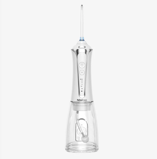 מכשיר נייד של חברת H2OFLOSS לשטיפת הפה ועיסוי החניכיים. מגיע בצבע לבן.